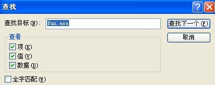 然后单击“开始”按钮,单击“运行”,输入“regedt32”,打开注册表编辑器。在注册表编辑器窗口中,单击“编辑/查找”,输入“fun.exe”:如下图: