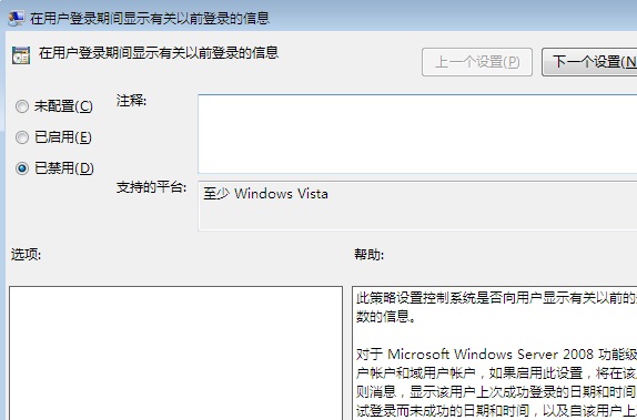 其次将鼠标定位在“计算机配置”分支上,并逐一点选“管理模板”、“Windows组件”、“Windows登录选项”,双击“在用户登录期间显示有关以前登录的信息”组策略选项,弹出如图4所示的选项对话框,选中“已禁用”选项,再保存好上述设置操作,那样一来用户日后登录系统时就不会对外泄露登录隐私了。
